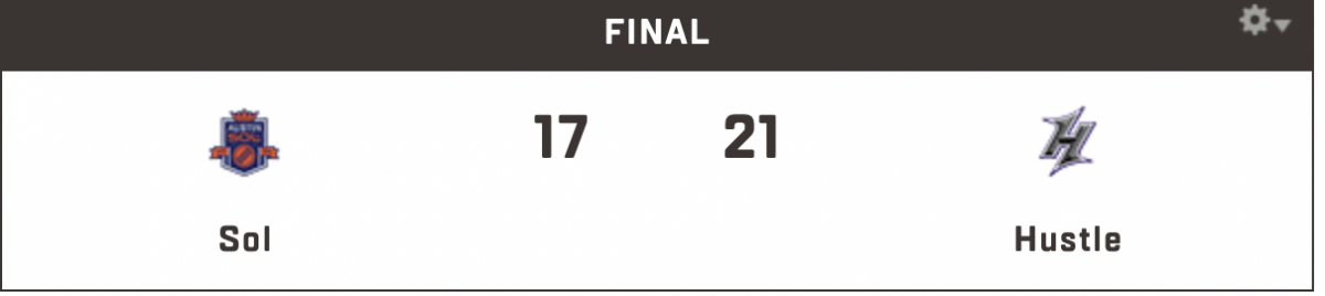 The Atlanta Hustle defeated the Austin Sol last Friday 21-17 thanks to a big performance from Dean Ramsey and solid play throughout the game from the Hustle. Ramsey finished with 4 goals, 1 assist and a team high 319 receiving yards. He consistently made great plays to get open as a receiver, and Austin had trouble covering him in one on one situations. The defense started strong in the first half only allowing 6 goals for an Austin team that had been averaging 15 points per game in the first half in their last two games. The D-Line helped the Hustle maintain their lead forcing 17 turnovers and converting 8/13 scoring opportunities.