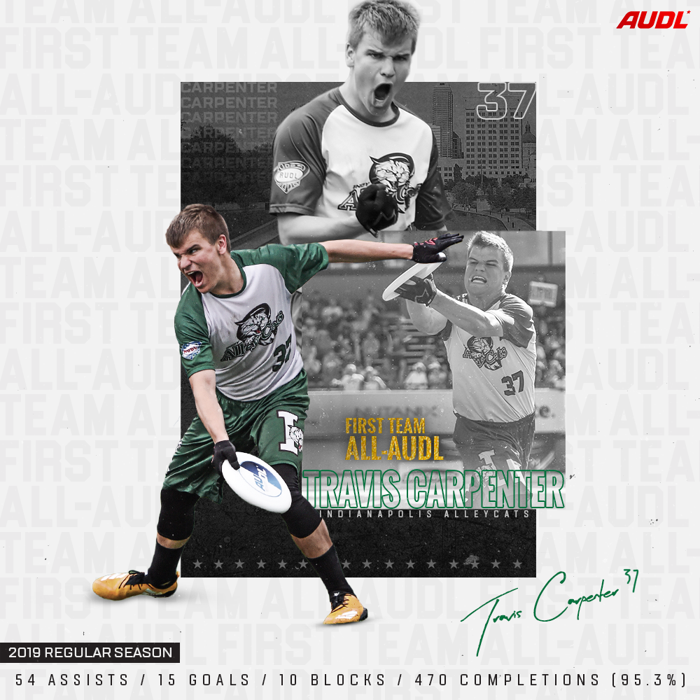 One of just six players to play in every season since the league's founding in 2012, Travis Carpenter is making his first All-AUDL team in his eighth season with the Indianapolis AlleyCats. The 26-year-old did a little bit of everything for the 'Cats in 2019, helping the team clinch their first division title since 2012 by emerging as one of the premier distributors in the AUDL; Carpenter put up a career-high 61 assists in 2019, sixth most in the league.