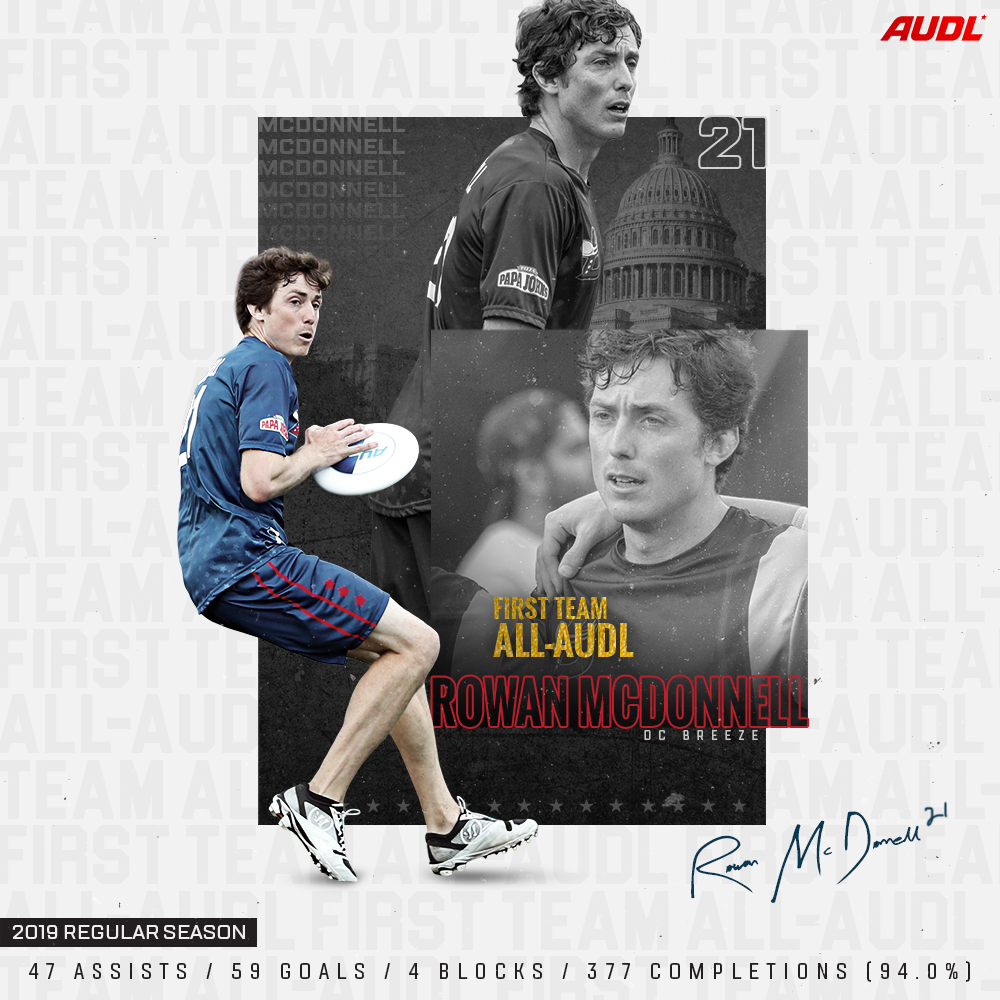 MVP a season ago, Rowan McDonnell had an arguably even better individual season in 2019. He finished tied for second in the AUDL in goals scored, 11th in assists, and was fifth in points played per game with nearly 28 per game. The DC Breeze endured a lot of roster turnover from 2018 to 2019, and McDonnell only seemed to improve.