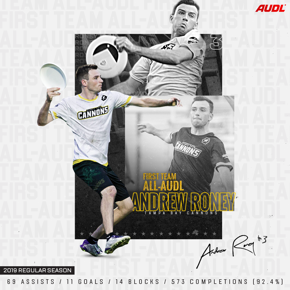 Roney was voted best in the South Division in multiple throwing categories, highlighting his dynamic ability with the disc. 2019 also marks the third straight season he has finished with 50+ assists and 400+ completions.