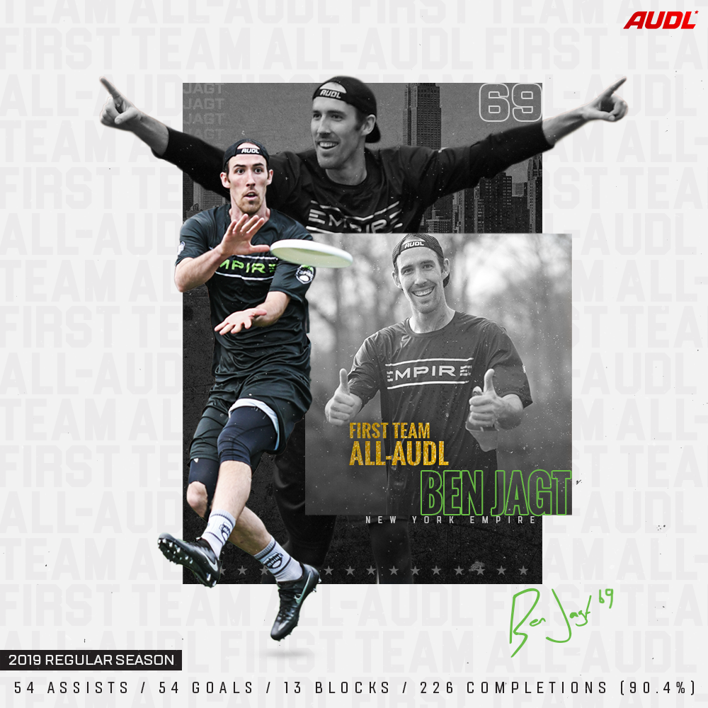 Jagt was especially impressive in primetime in 2019. He had a nine-assist, eight-goal performance against DC in a critical double overtime win in May. He was equally potent against Raleigh in another double overtime thriller in June, posting nine assists and six goals in the Empire win. And finally and most importantly, he submitted a five-assist, six-goal, zero turnover spectacle in the 2019 AUDL Championship Game.
