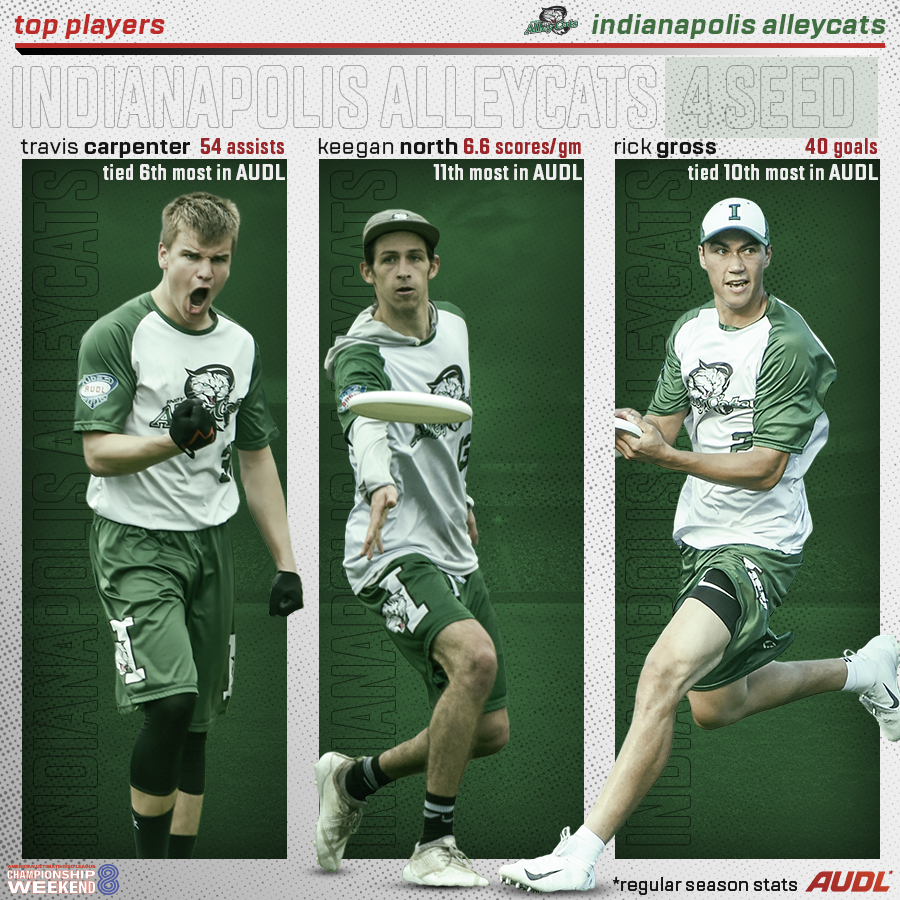 - Adaptability — Owing to their internal knowledge of each other, Indy is great at interchanging player roles actively during points. North may start off in the handler set, but move his way upfield into a receiving role if he likes his matchup. In opposition, Levi Jacobs almost never rotates into the handler set, but is the team's number one option for hucking. Carpenter is one of best distributors in the league this season, but can also be converted into a coverage defender when the team needs stops. This close to their first title, don't be surprised to see Indy's stars receiving heavy minutes in a variety of positions.