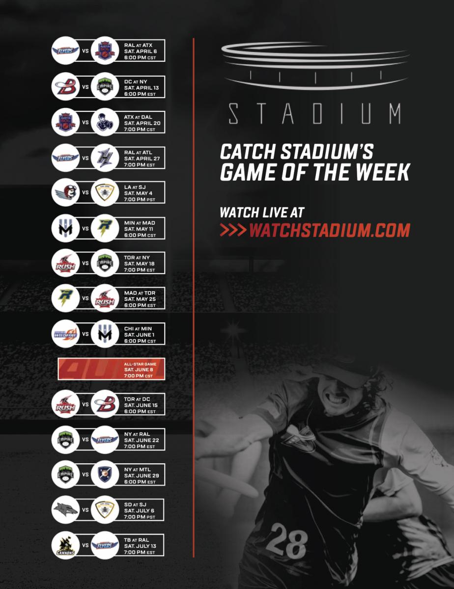 For the second straight season, the AUDL and Stadium will be partnering up to bring you the Game of the Week live primetime broadcasts. Every week from April through August, viewers can tune into Stadium's numerous platforms for the pro ultimate showcase matchup. The 2019 regular season begins with a rematch of last season's South Division playoff matchup between the Raleigh Flyers and Austin Sol next Saturday, April 6.