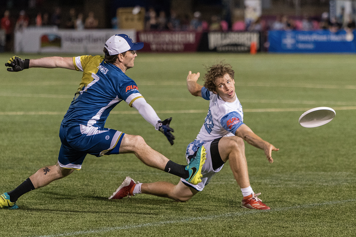 Seeded first at Championship Weekend due to overall point differential, the Union matched up with the fourth-seeded Raleigh Flyers in the semifinals. Both offenses got off to relatively slow starts, as the Flyers took an 8-7 lead into halftime. Chicago looked to be putting the clamps on Raleigh in the second half, scoring the first three goals of the third quarter and maintaining their break advantage for the vast majority of the fourth quarter. But the Flyers wouldn’t quit. They kept punching back after each Union score, then when the Chicago offense ultimately made a couple costly mistakes on back-to-back points, Raleigh jumped ahead to a one-goal lead late in the fourth. While Chicago was able to tie it up with seconds left to send the game to overtime, the momentum had shifted in Raleigh’s favor heading into the first overtime in Championship Weekend history. Keegan North couldn’t pull down a Kurt Gibson hammer on Chicago’s final possession, and the Flyers came away with a 21-20 win to advance to the finals.