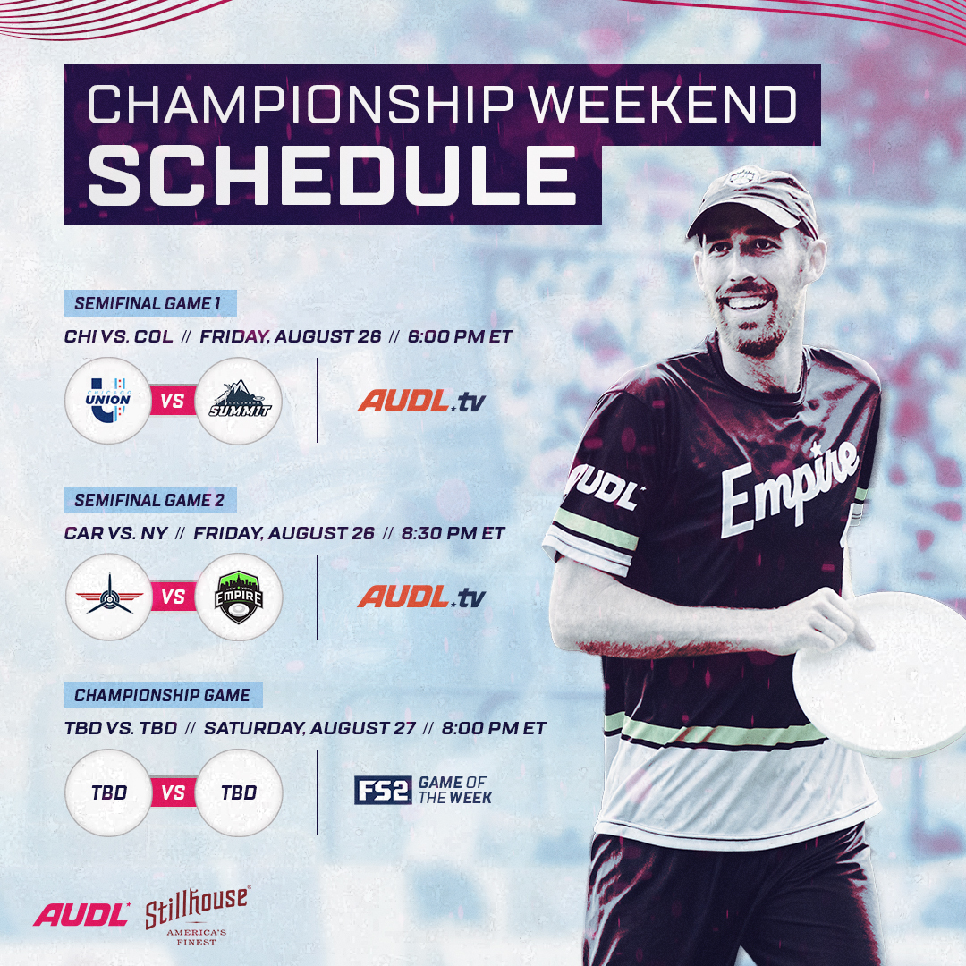 All three Championship Weekend games will be available to watch live. Starting on Friday, August 26, both semifinals games will be available on AUDL.tv, with the 2022 AUDL Championship Game broadcast on Saturday night live on FS2 FOX Sports.