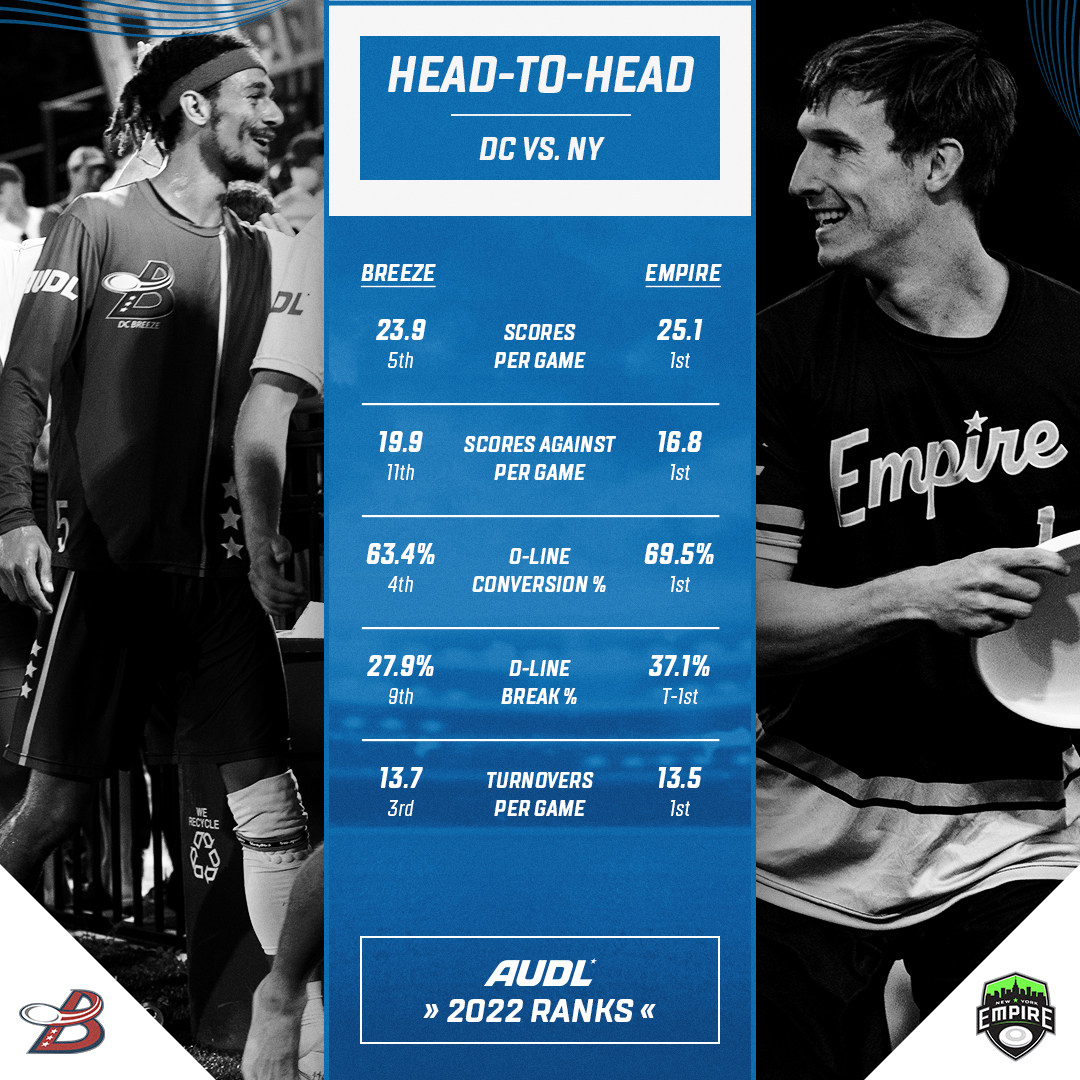But for as good as the Empire have been this year, the Breeze have the defensive talent and ability to generate pressure and disrupt New York enough for break opportunities. The DC defense is the second best squad in the league this season at converting break scores, and despite the Empire committing just 19 total turnovers in two matchups during the regular season, the Breeze were able to convert 7-of-11 break chances. Just last weekend against Philly, the DC D-line was able to swing momentum when a Moussa Dia block was followed shortly by an AJ Merriman bomb for the score; Breeze have converted 50 percent or better on break chances in 11 of 13 games this season.