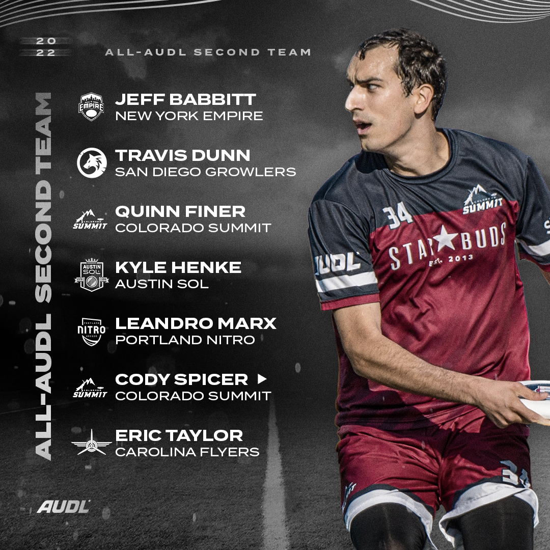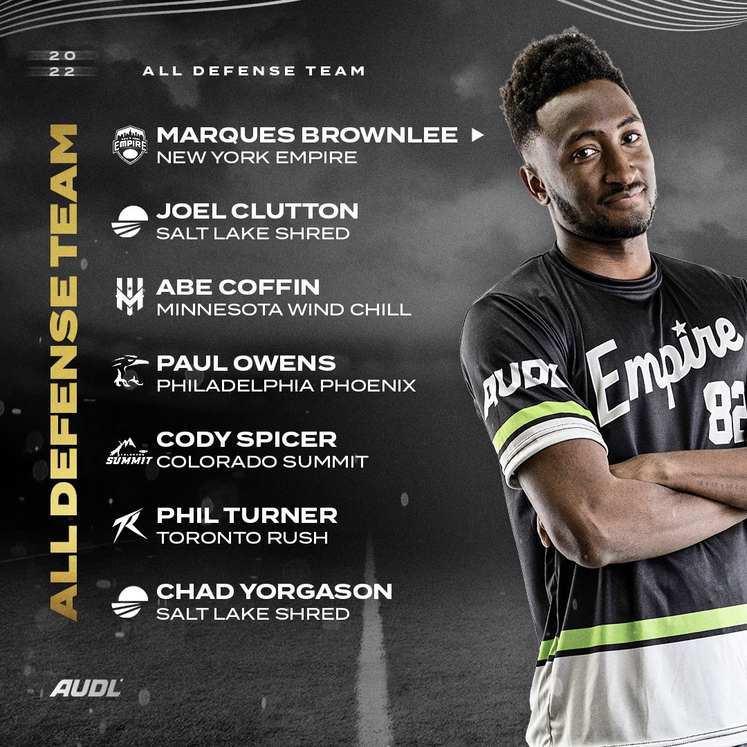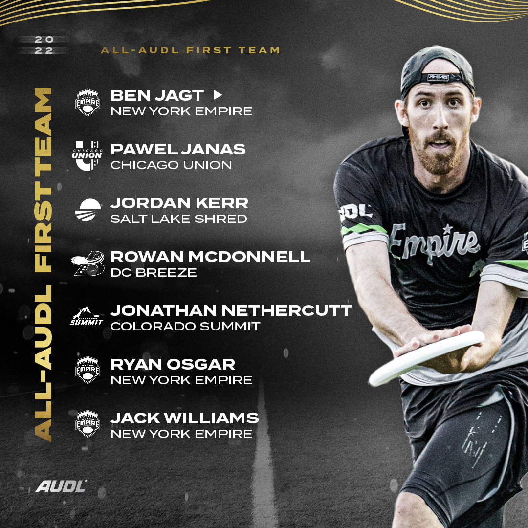 The AUDL is proud to announce the 2022 All-AUDL team selections. Ryan Osgar was announced as the seventh MVP in league history on Tuesday, capping a perfect 15-0 season on the Empire with the AUDL's highest individual honor. Osgar, Ben Jagt, Pawel Janas, and Jack Williams have all earned their second straight All-AUDL First Team selection; the two-time MVP Jagt has been chosen for four consecutive First Team selections. Rowan McDonnell has been selected to First Team for the third time in four seasons, while Travis Dunn has been made a First or Second Team selection for four consecutive seasons. Pawel Janas becomes the first player in AUDL history to make five consecutive All-AUDL selections, including four First Team seasons.