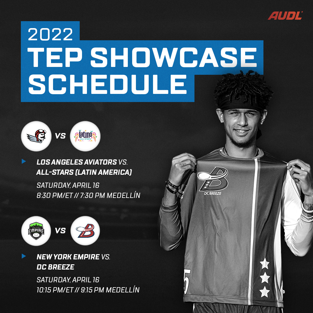 Three AUDL teams—the DC Breeze, Los Angeles Aviators, and New York Empire—will be heading down to Medellín, Colombia next week to compete in the annual TEP international tournament. The event will act as both a showcase for the new SKY-AUDL initiative, as well as a preseason primer for the three featured squads. The two showcase exhibitions will take place on Saturday, April 16 and will be available live on AUDL.tv.
