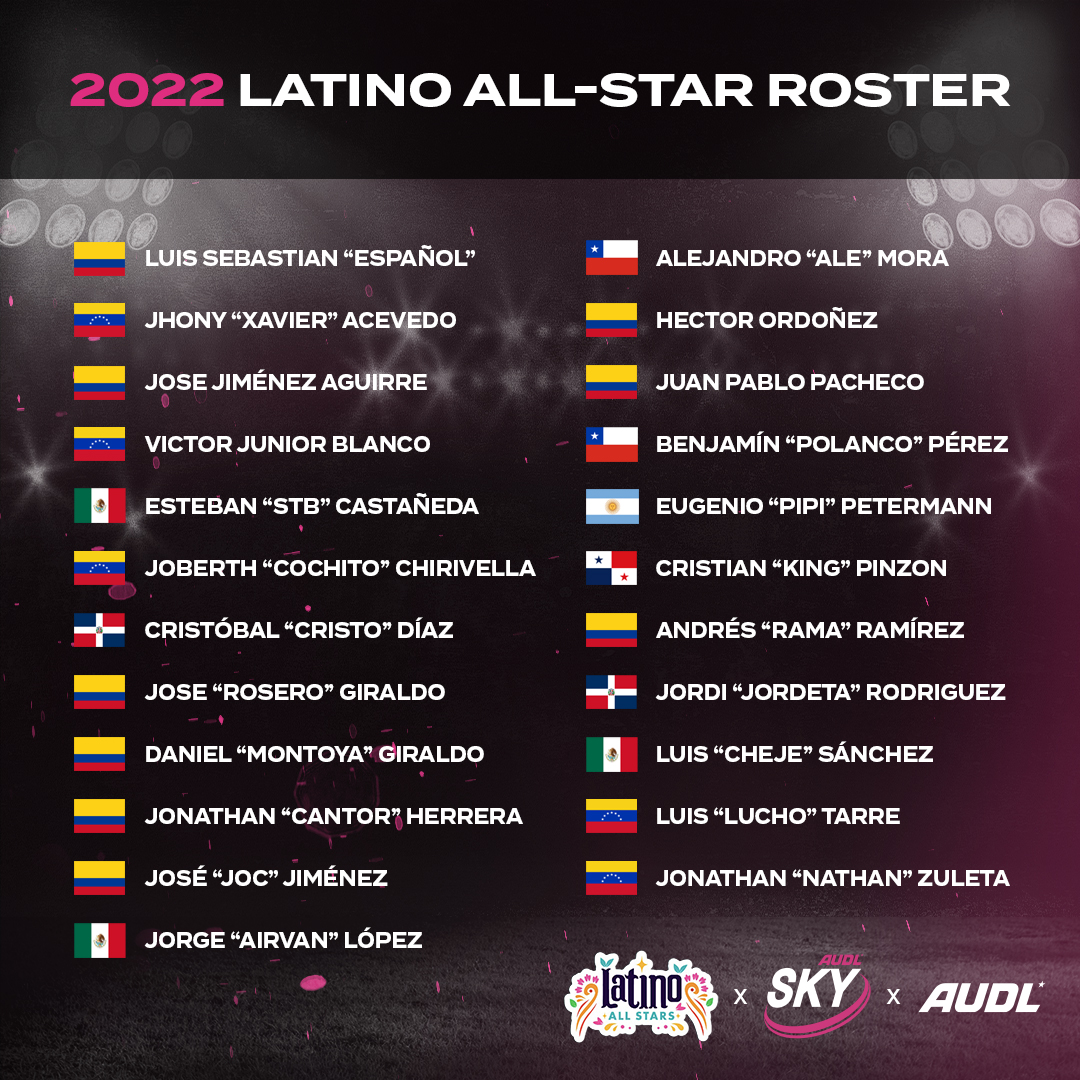 The Latin American All-Star team for the 2022 AUDL Showcase is some of the best Ultimate talent from countries across North, Central, South America and the Caribbean. This team, with representatives from El Rio Grande to the Patagonia, will serve as the beginning of a Latin American professional development program. This extraordinary mix of experienced players from seven countries will showcase their talents during this unique AUDL event.
