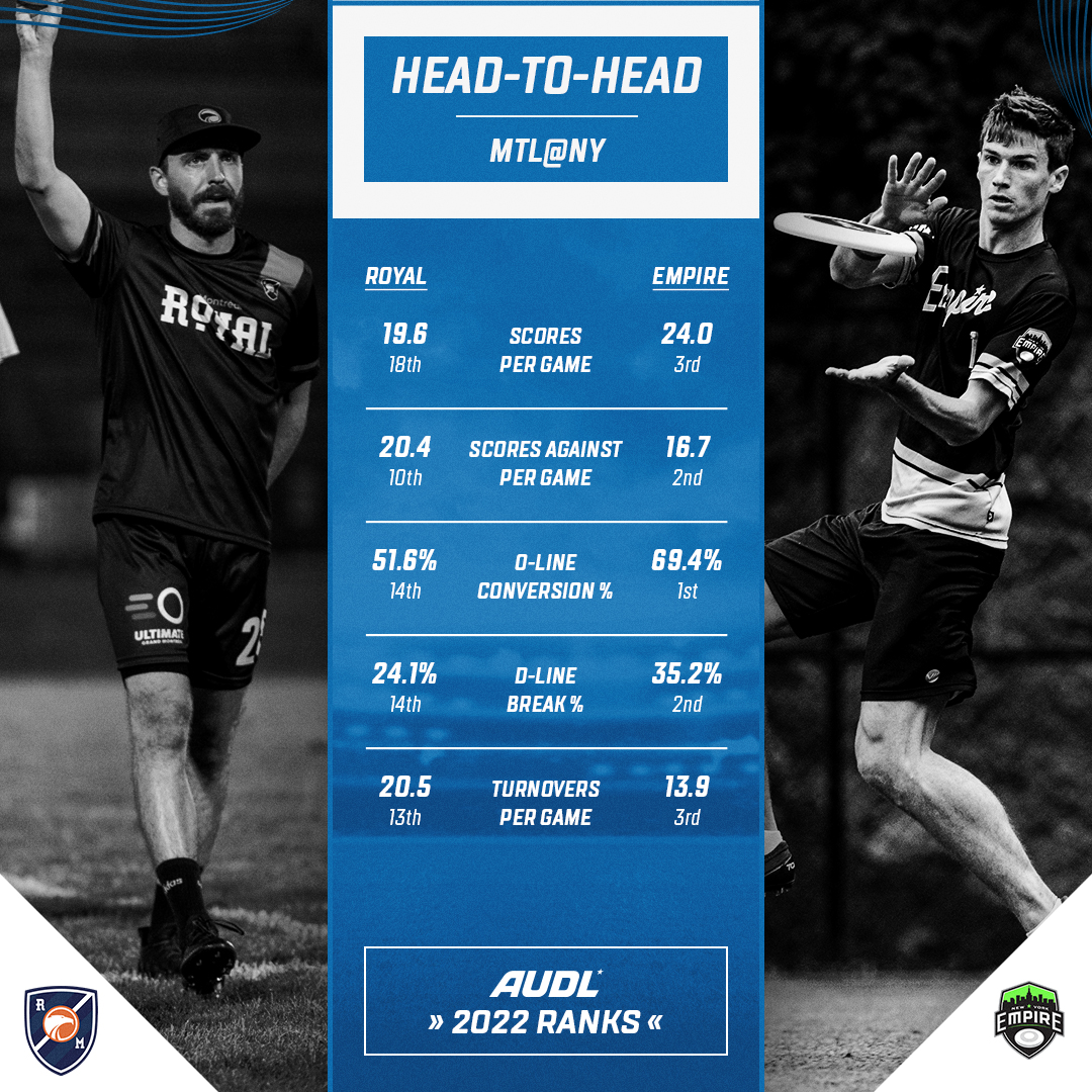 Brissette may be throwing to a semi-new cutting core this week, as Sacha Poitte-Sokolsky and Hayden Stone aren’t expected to play. These absences could shift Royal receiving leader Malik Auger-Semmar back to offense, or thrust 2019 All-AUDL First Team selection Quentin Bonnaud into a full-time role this week after he was eased into action on both O and D vs. Toronto. But with the majority of their O-line starters completing less than 94 percent of their throws, Montreal will have to tighten up across the board if they intend to hold off a break train from the Empire defense.
