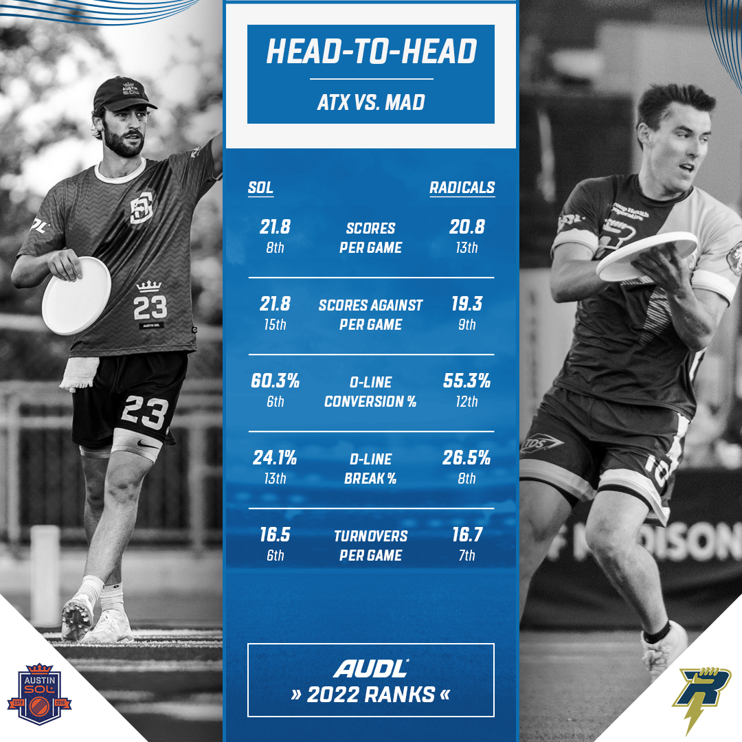 The Sol D-line may get some respite tonight in Madison, as the Radicals have struggled to establish their deep attack so far in 2022. With Kai Marcus lost for the season to injury, Madison is just 16-of-35 (46 percent) on hucks in their last three games, and rank bottom five in the league for the season in huck completions per game. Victor Luo has shown more aggressiveness attacking the deep space with his throws in the last two games, but generally the Radicals offense has stuck to its traditionally patient attack. The Sol defense could be problematic if their athletes can get good reads on short routes—Austin defenders are very good at attacking the disc in space, especially on under throws; Mick Walter started the third quarter against the Union with a big poach block.