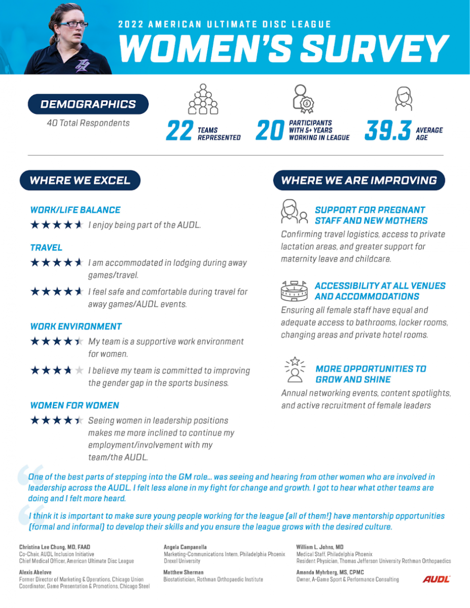 A summary of the 2022 Women’s Survey can be found in the image below. For more information contact Christina Chung (christina.chung@theaudl.com) and follow along for more content around the leading women of the AUDL.
