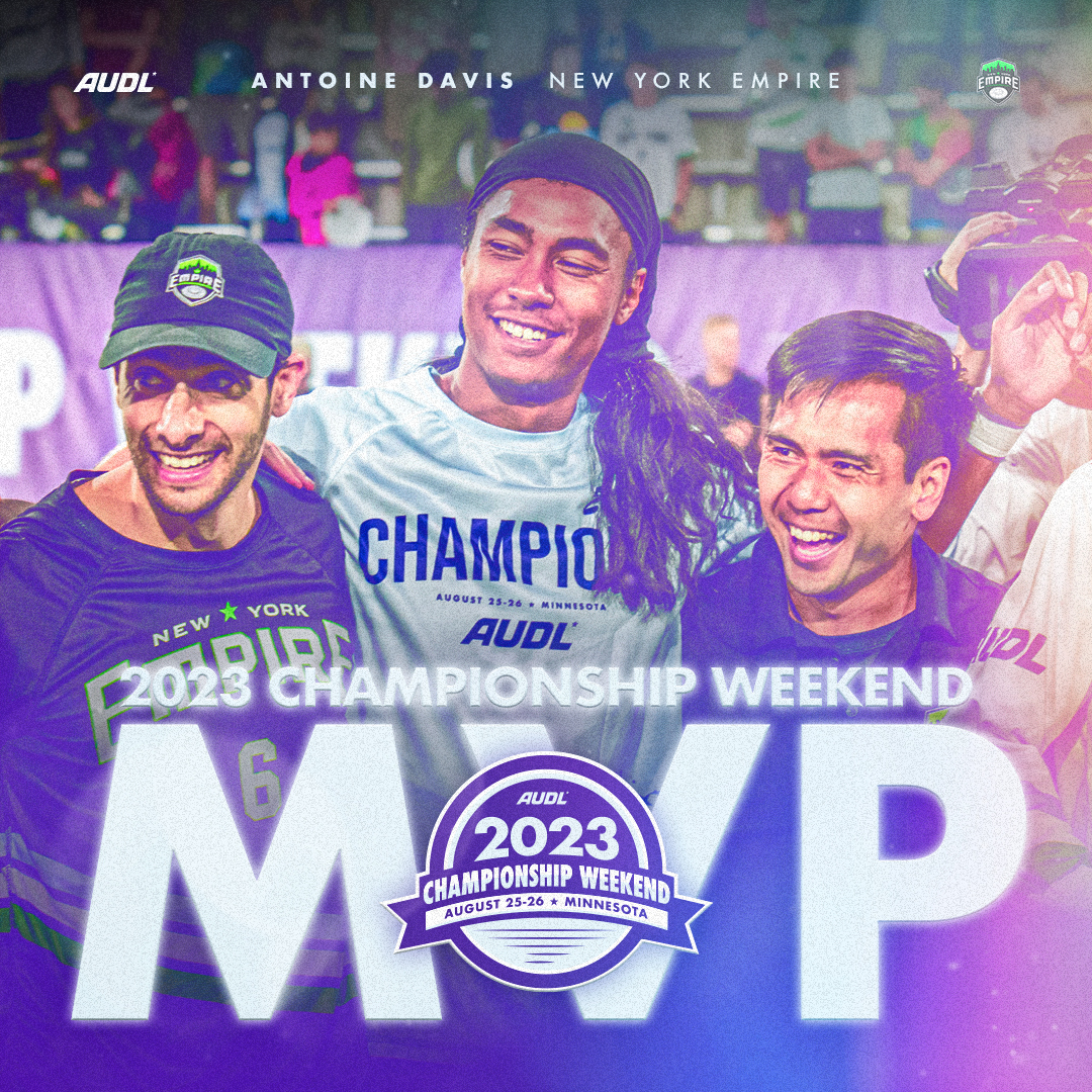 With five blocks and shutdown coverage in New York's semifinals and championship wins, defender Antoine Davis claims the 2023 AUDL Championship Weekend MVP award. Davis won his third championship of his career in 2023, helping the Empire earn back-to-back titles.