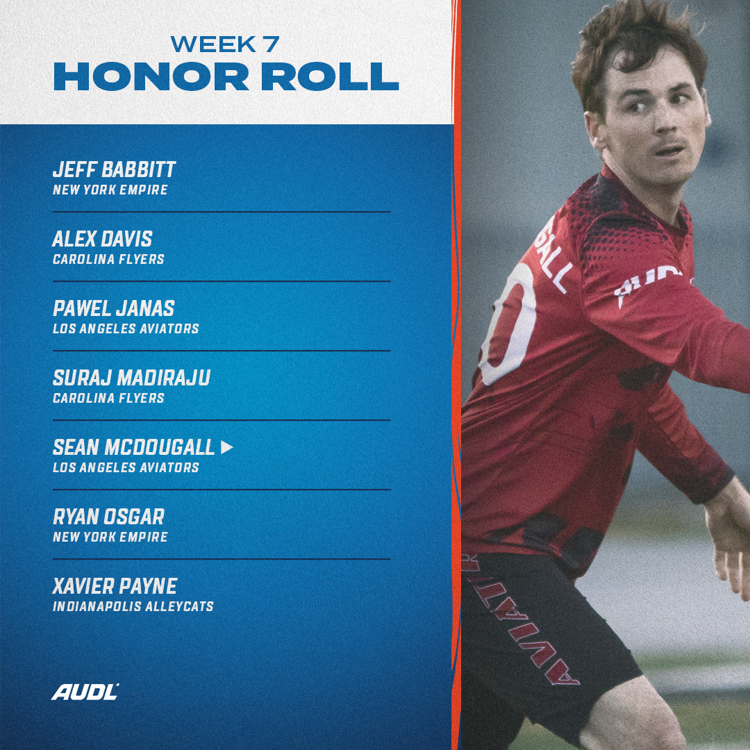 Throughout the 2023 season, the AUDL’s weekly honor roll will be revealed each Monday, honoring seven players whose individual exploits merit recognition. The players are listed alphabetically by last name.