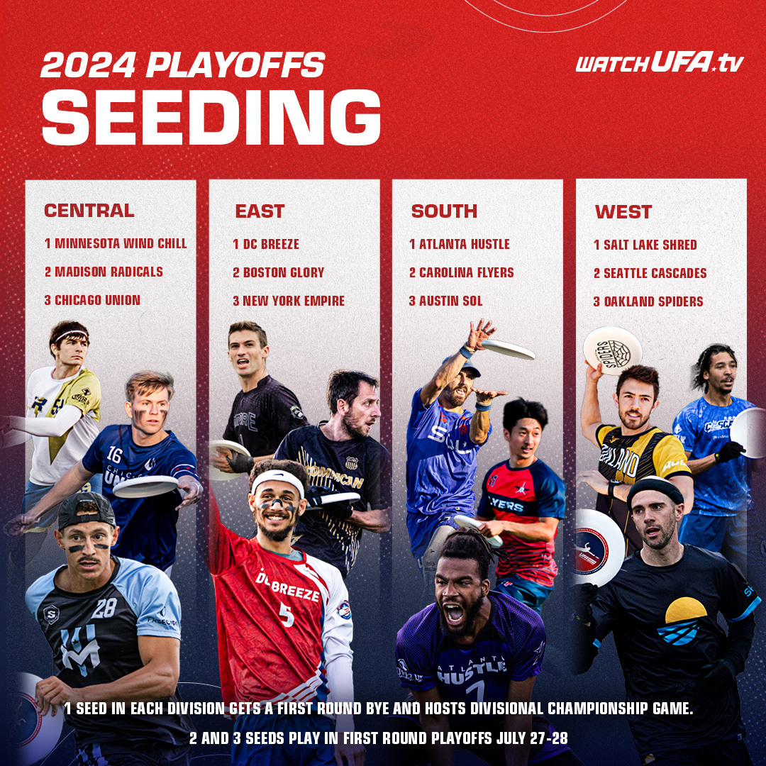 Following the conclusion of the 2024 UFA regular season, the 12 playoff teams are set. Eight teams will compete in the first round of the playoffs, with the two seed of each division hosting the three seed. The winner of each first round matchup will advance to face the regular season division champion in the divisional championship round. The four winners of the divisional championship round will move on to 2024 UFA Championship Weekend to decide the league champion, on August 23-24 in Salt Lake City, UT.