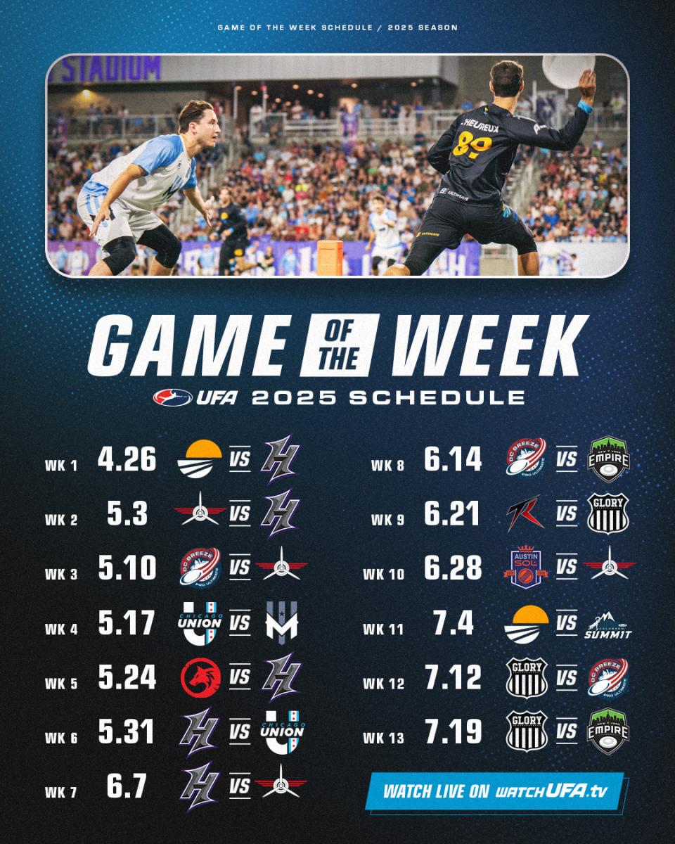 For the 12th straight season, the Ultimate Frisbee Association is proud to announce its "Game Of The Week" broadcast schedule. Every week during the regular season, tune in to watchUFA.tv for a premiere live game, starting with a thrilling first-ever matchup between two championship hopefuls on April 26.