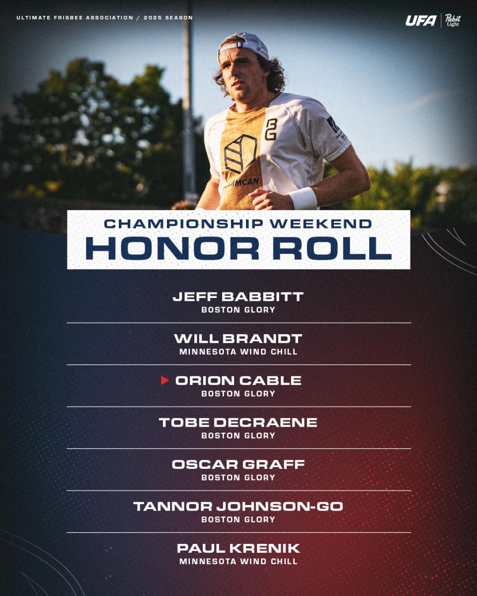 In his first two seasons with Boston—2023 and 2024—Oscar Graff only had 33 total completions across 13 games played. And heading into Saturday’s championship game against Minnesota, Graff was averaging fewer than 15 completions per contest in the four games he’d played for the Glory in 2025. So that’s the backdrop leading to everyone’s amazement as the young Tufts product erupted for 37 completions in Saturday’s final, with no turnovers. For the weekend, Graff went 56-for-56 passing with two goals, two assists, five hockey assists, and no turns, keeping the disc moving and helping the Glory D-line convert 16 breaks in 17 chances, an absolutely astonishing show of efficiency and execution. In addition, Saturday also marked a new career-high in throwing yards for Graff, as he totaled 119 passing yards in the championship game victory. That’s more passing yards than he’s produced in any of his four UFA regular seasons.