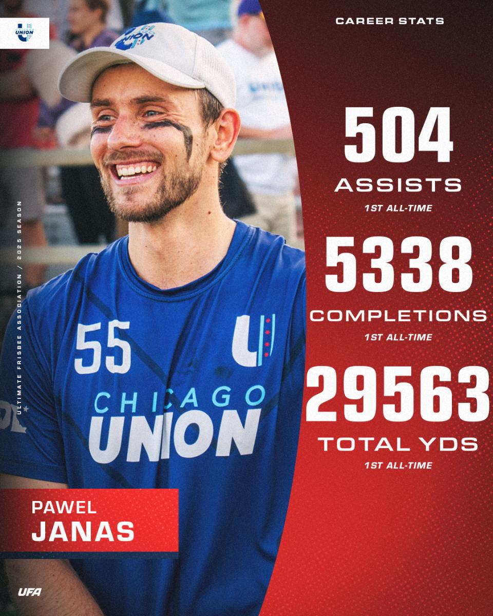 Pawel Janas ended his multi-year contract with Los Angeles today, and re-signed with his former team the Chicago Union for the 2025 season. The league’s all-time leader in assists, completions, hockey assists (throw before the assist), and total yards, Janas was selected to five straight All-UFA teams with the Union from 2017 through 2022, and helped Chicago to back-to-back Championship Weekend appearances in his final two seasons with the squad.