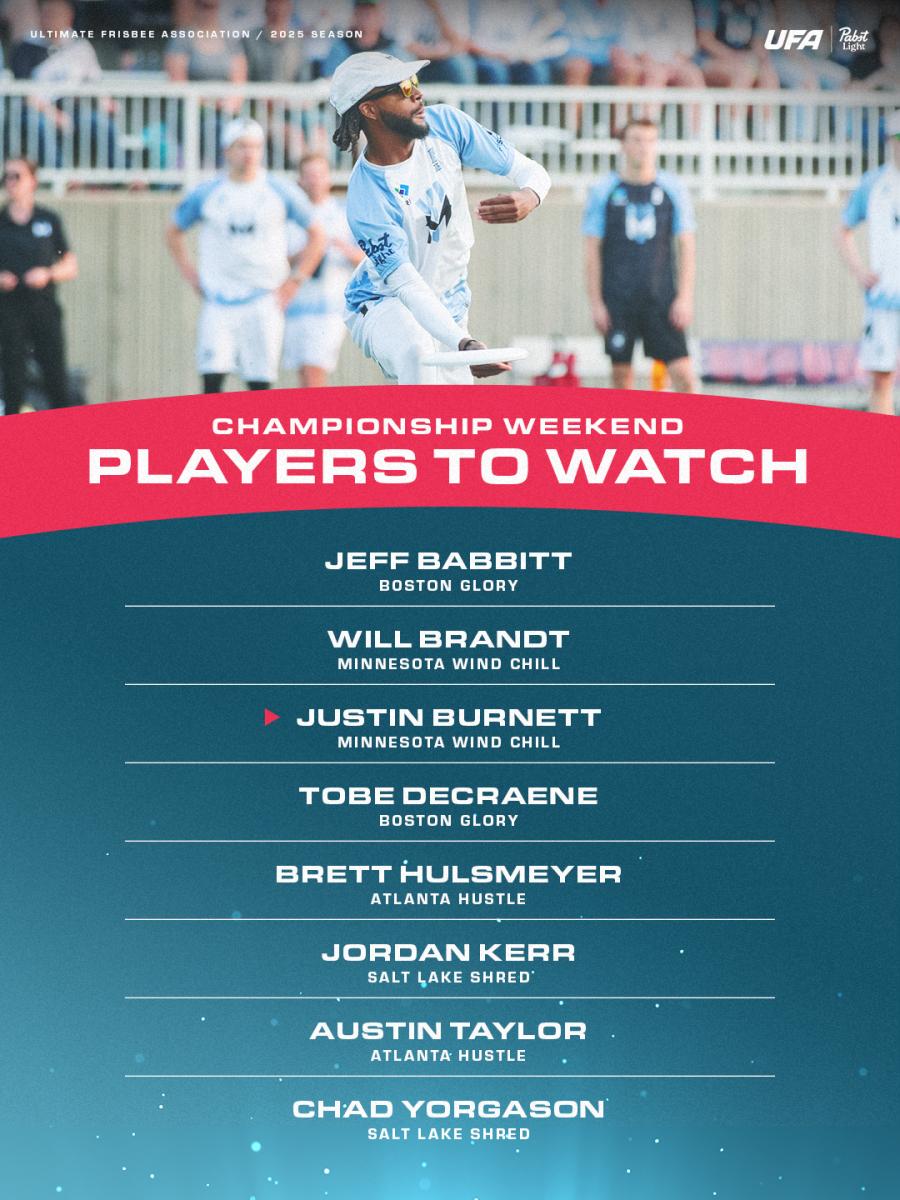 Was Justin Burnett’s performance in the Central Division Championship Game enough to lock up Defensive Player of the Year? In the Wind Chill’s upset win over the Union, Burnett made multiple game-breaking plays against the guy who many believed (myself included) to be the MVP frontrunner, Chicago’s Daan De Marrée. Two weeks prior, Burnett recorded multiple blocks, including a Callahan, in Minnesota’s first round win over Madison. He’s the hottest defender in the league right now and is flying around relentlessly to get blocks, and heading into a rematch against his former team, this revenge game should be one of the main headlines of the weekend. Burnett matched up with Atlanta’s Hayden Austin-Knab in their Week 6 meeting and came away with one assist, three blocks, and Player of the Game honors. I fully expect him to wreak havoc once again in primetime.
