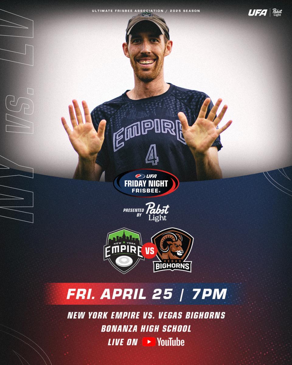 "Friday Night Frisbee" is a weekly showcase game streamed live and free on the UFA YouTube channel. Next Friday’s matchup features a compelling interdivisional matchup between the heavyweight New York Empire and the league's newest expansion team, the Vegas Bighorns.