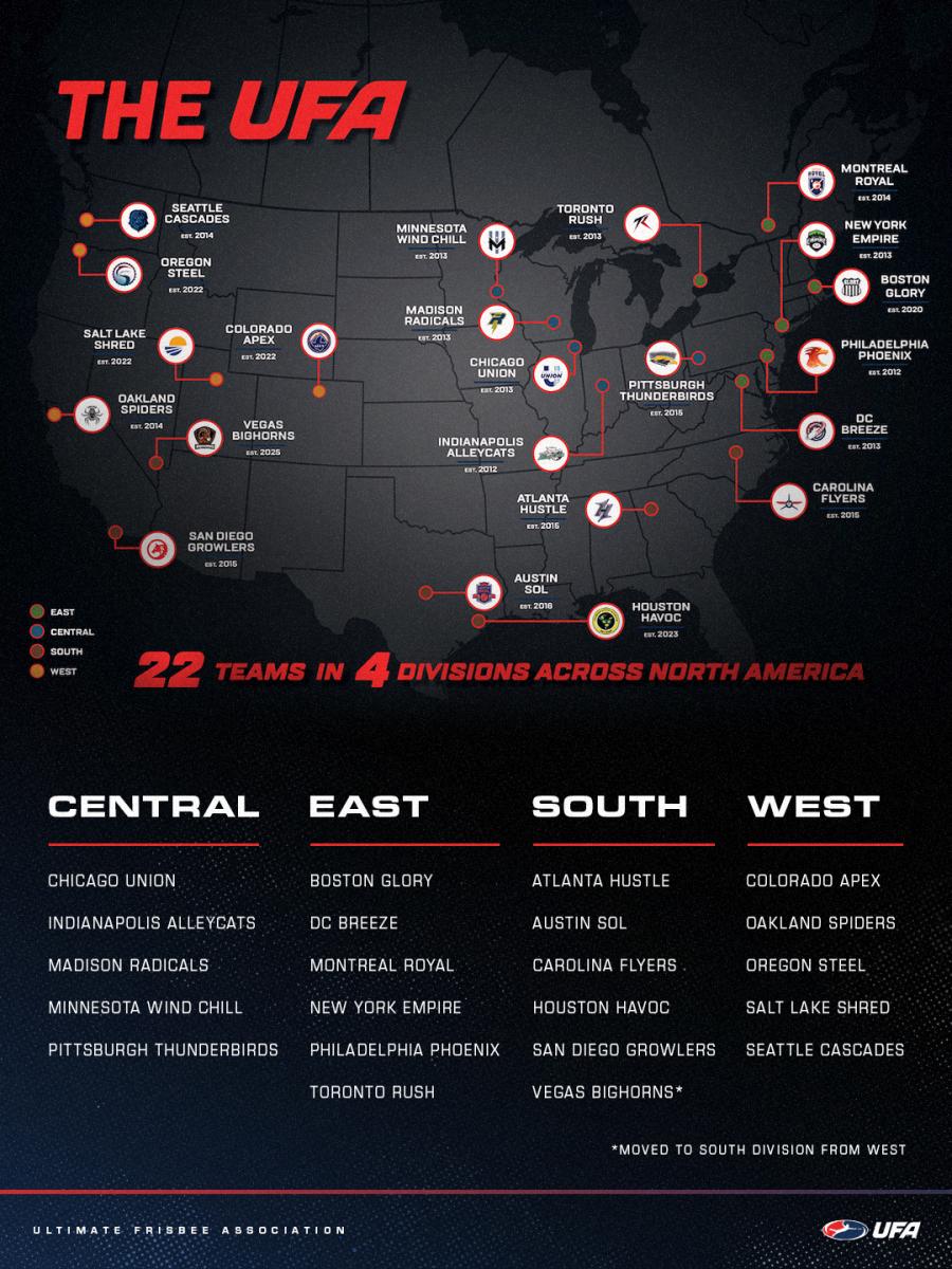 The turning of the calendar to 2026 means that the new UFA season is fast approaching. Here's a list of all 22 teams and their respective divisions heading into the new season starting in April.