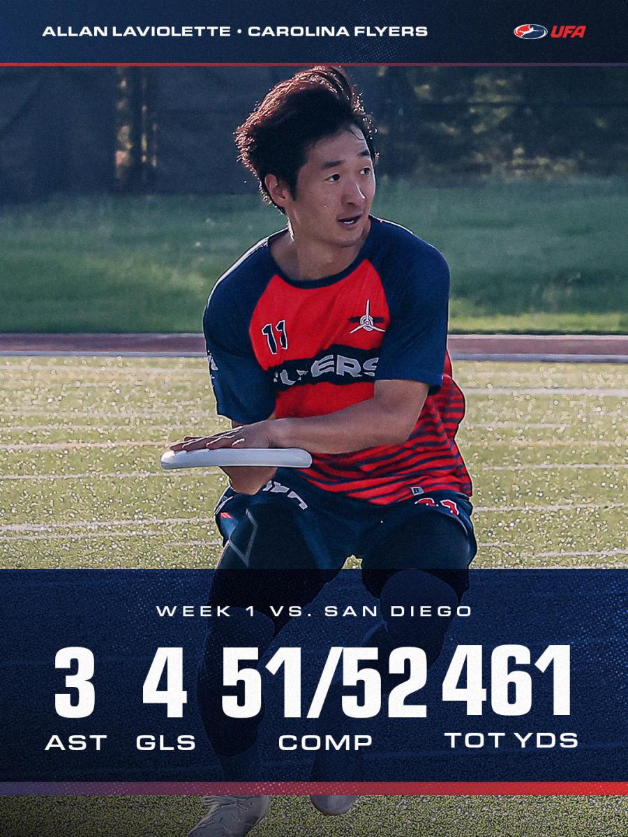Despite missing the playoffs for the first time in franchise history in 2025, the high octane Carolina Flyers (1-0) offense picked up right where they left off last year and earned a 22-20 win over the San Diego Growlers (0-1) on “Friday Night Frisbee”. The Flyers committed a franchise-low six turnovers on Friday against the Growlers, and bled the last two minutes of game clock on their final possession to secure the two-goal victory. Allan Laviolette finished with seven total scores and 461 total yards on 51-of-52 throws, while Jacob Fairfax and Walker Matthews both contributed three goals apiece.