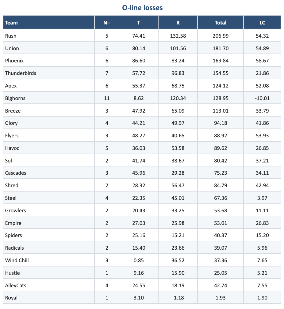 The Rush lost 206.99 O-line aEC, the largest offensive loss in the league, including 132.58 R-aEC, also the largest receiving loss. They also lost 4.70 D-line aEC/100 and added back only 1.78.