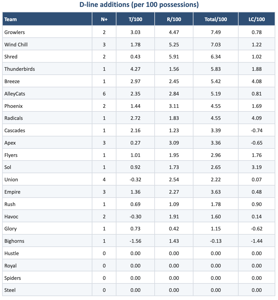 The Growlers added 108.38 O-line aEC, with strong numbers across both throwing and receiving, and they also added 7.49 D-line aEC per 100 possessions, the best defensive incoming mark in the league. That combination is relatively uncommon and likely stems from pieces arriving from the defunct Aviators.