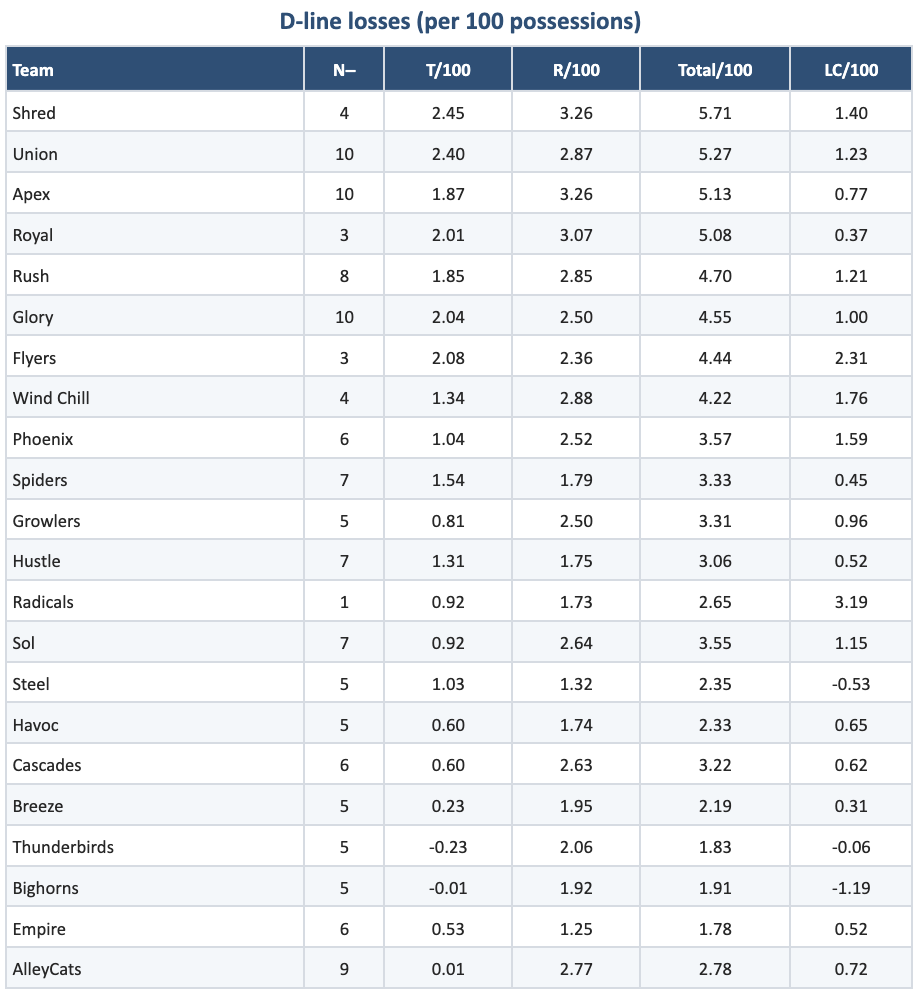 A note on the defensive numbers: D-line players get fewer possessions and fewer offensive opportunities after turns than O-line players do, which makes raw season totals unreliable for comparison. Instead, the defensive tables use per-100-possession rates: how much value those players generated each time they had a break chance, rather than how much they accumulated over a full season.