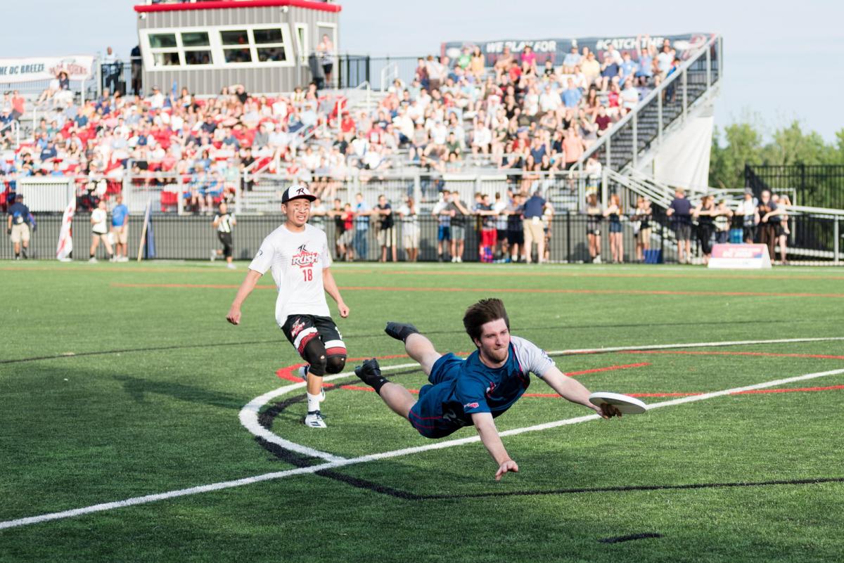 As Monday’s AUDL Honor Roll noted, multiple players across both teams enjoyed huge individual nights, as Rowan McDonnell (six assists, two goals, one block) and Max Cassell (nine goals) paced the DC attack and Cam Harris (five assists, four goals, one block) led the Rush playmakers with a slew of highlight-reel moments. The final result came down to just a few plays in the final quarter, and the Breeze were elated to succeed on Saturday where they had failed in the past.