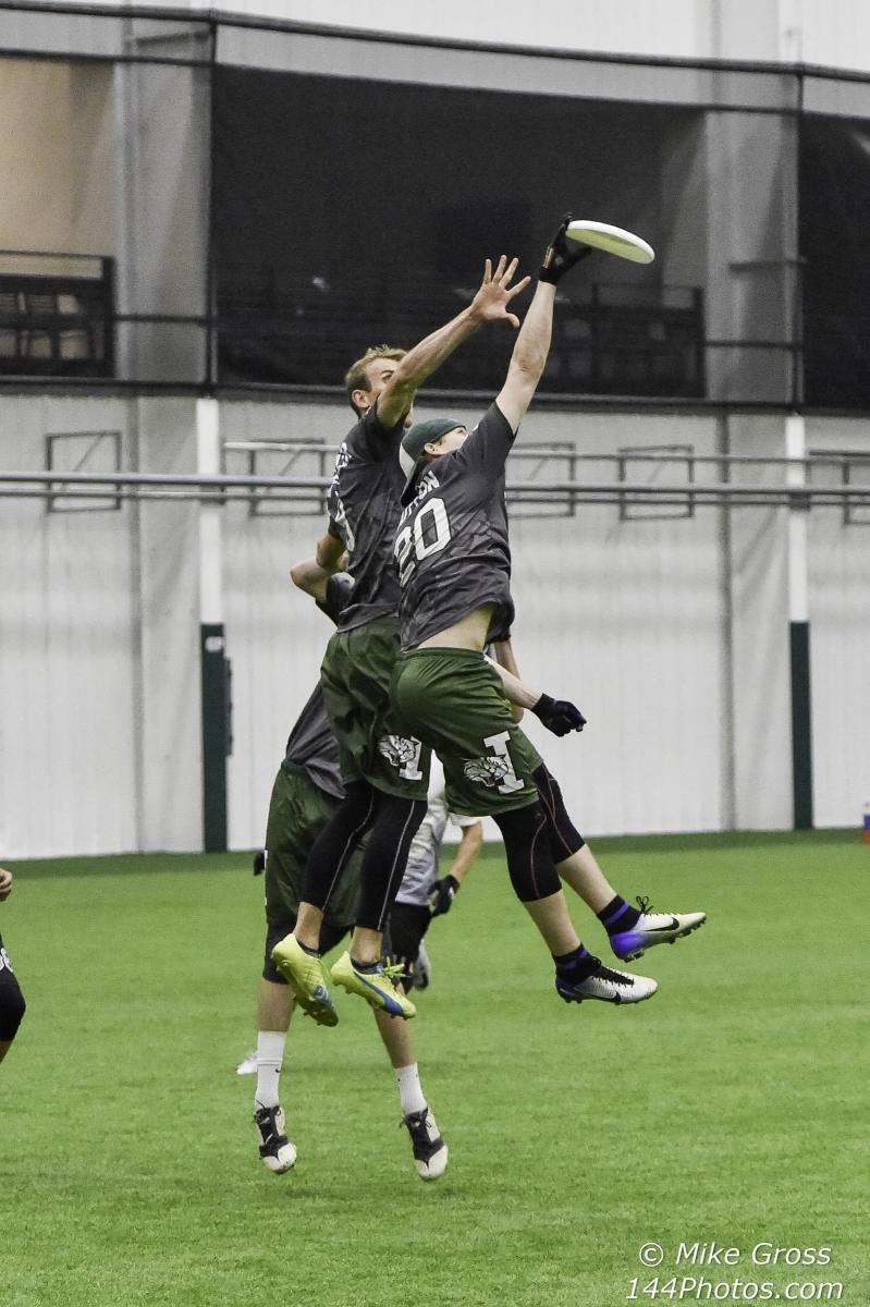 “Late in the game when it was tied up [at 22], I took a deep shot to Rick Gross,” explained Indy’s Travis Carpenter. “The game was extremely tense at this point. Every possession was critical. Nerves were high. Both teams had started getting a bit chippy and pretty upset with the refs when a call did not go their way. By the time the disc was about to reach the end zone, three defenders had all caught up to Rick and were bodying him up. Two of the guys were not making a great play on the disc and were more concerned about Rick, to the point that they knocked him to the ground pretty hard in a sandwich between them. After Rick hit the ground, the disc then reached a defender and he swatted the disc away. There was no call made, and the entire [Indy] crowd went nuts. It was the loudest I have ever heard our home crowd yell before.”