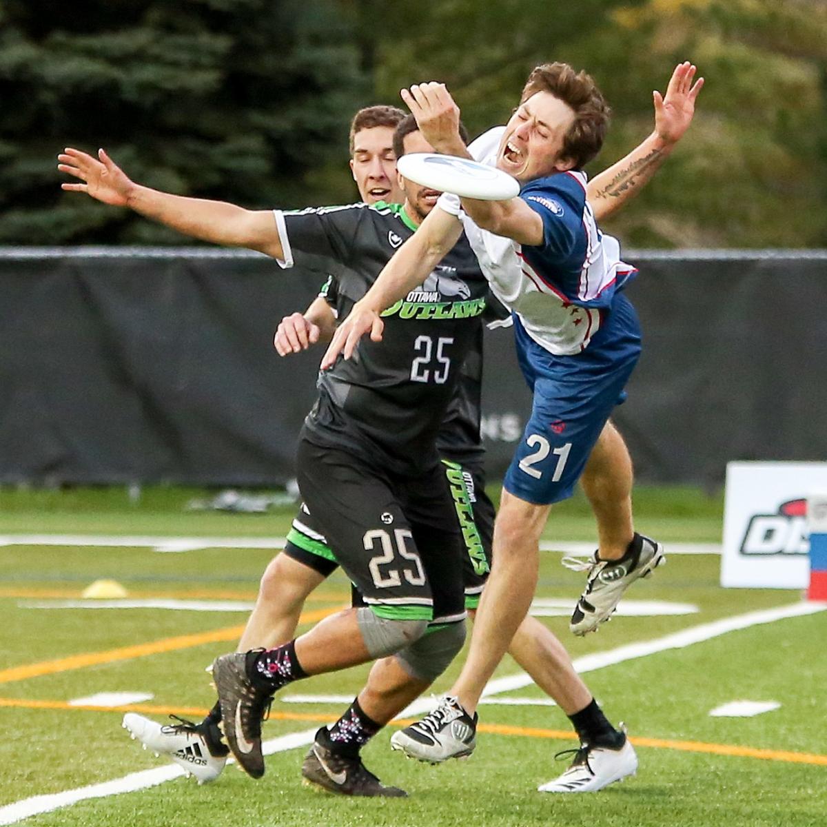 “Regarding our use of the timeout, there were numerous jokes exchanged with the DC captains and coaches when were heading to overtime regarding the timeout situations, but us using a timeout in double OT definitely wasn’t meant as a joke,” said Outlaws handler Karl Loiseau, who completed all 40 of his throws to help lead Ottawa on Saturday night. “DC had been coming down very aggressively in handler coverage off their pulls, so we called a handler strike to try and catch them off guard. They ended up bricking the pull so the handler strike wasn’t effective against their set defense and left Nick [Boucher] stranded with the disc and no viable reset options and he ended up calling the timeout to reset the stall count.”