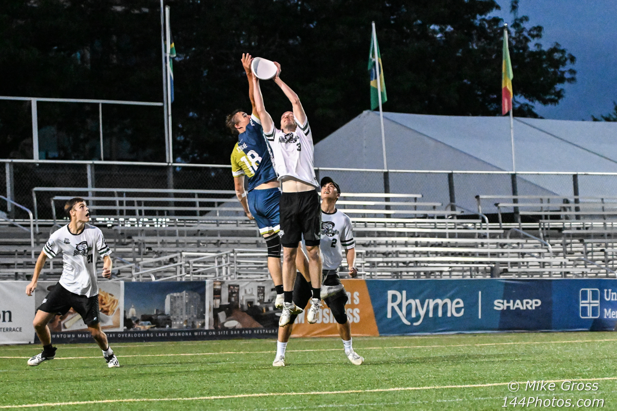 “We seized control in the fourth by simply wearing them down, I think,” said Brock. “Their O had a lot of struggles all night moving the disc quickly. They were forced to make lots of throws. Specs [Jake Fella] absolutely crushed his matchup on [Victor] Luo. A handblock, plus just making life more difficult for him in the backfield, allowed the rest of our D-line to be successful in their roles.”