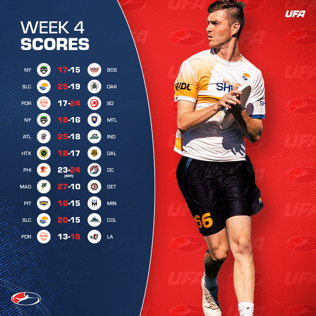 The Salt Lake Shred undoubtedly authored the most impressive overall performance in Week 4, producing 18 breaks over the course of their convincing 41-30 master class against the West’s other top contenders. The Shred did not lose a single quarter against either Oakland or Colorado, bringing precise offense and relentless defense to cement their midseason stature atop the entire UFA.