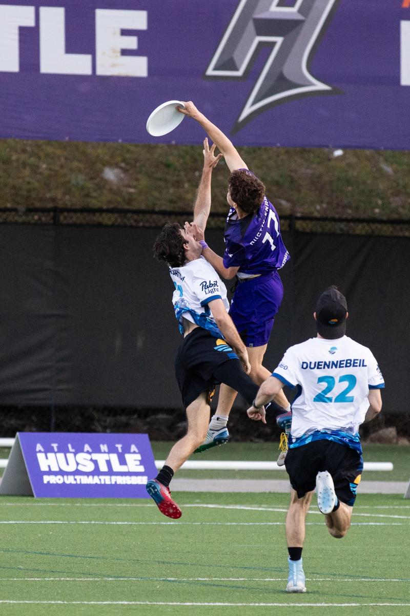 Cameron Brock, Sean Connole, and Alec Wilson Holliday all had strong debuts with the Hustle O-line, while Austin Taylor went 48-for-48 with five assists and Hulsmeyer finished 33-for-33 with five assists, one goal, and one block. But during the postgame locker room celebration, Atlanta awarded player of the game honors to Austin-Knab.