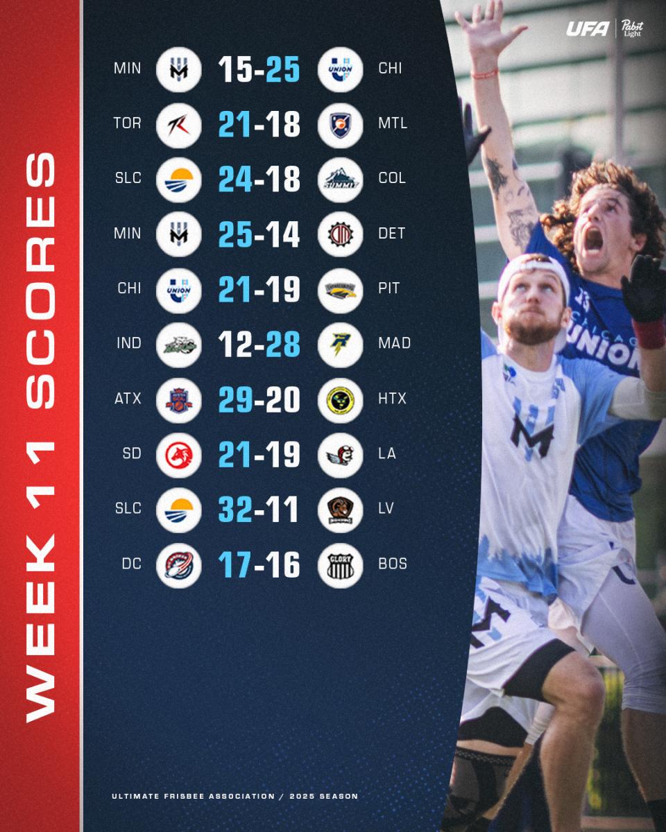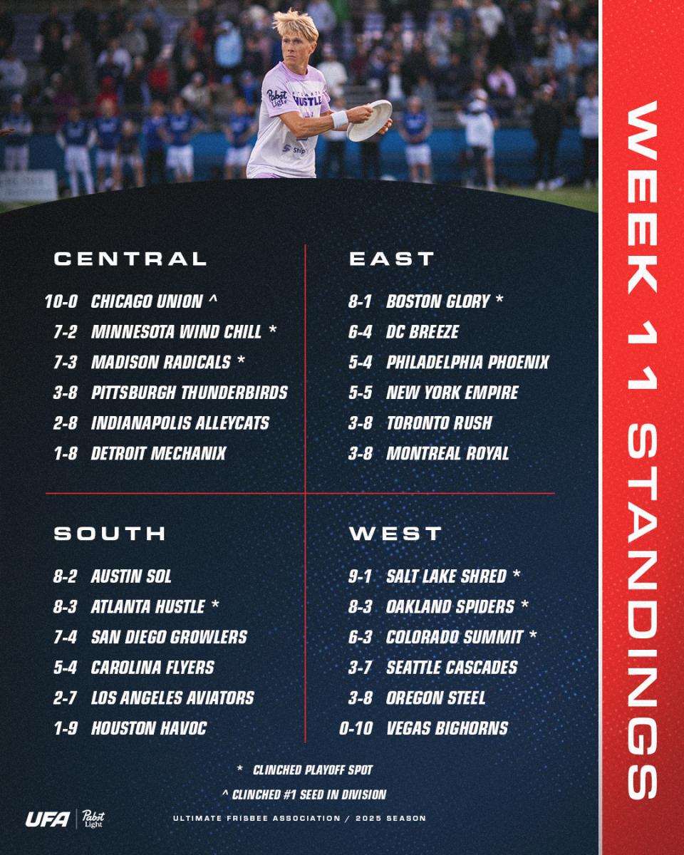 Elsewhere, the Salt Lake Shred also went 2-0 this past weekend, delivering their own distinct message by stomping the Summit. Unlike Chicago, the 9-1 Shred have not officially clinched the number one seed in their division yet, but they’re currently riding a nine-game winning streak into their final games of the season. They’ve got a rematch with Colorado and an interdivisional tussle with Minnesota, both of which will be at Zions Bank Stadium and featured on "Friday Night Frisbee."