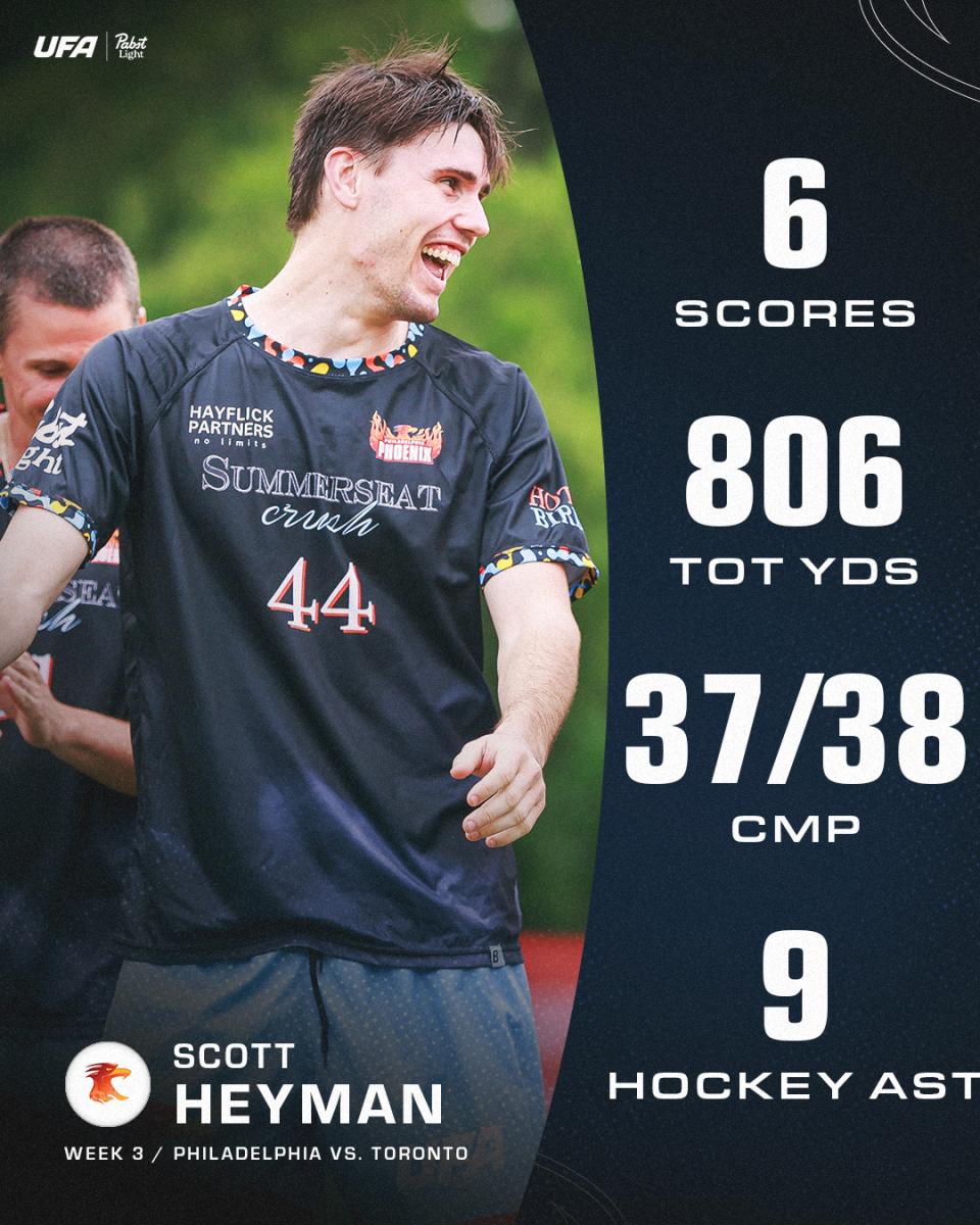 Scott Heyman continued to look like an All-UFA candidate, going 6-for-6 on his hucks, 37-for-38 overall, and racking up over 800 total yards to once again lead the Phoenix offense along with Sean Mott, who went 3-for-5 on his hucks and finished with a game-high eight assists.