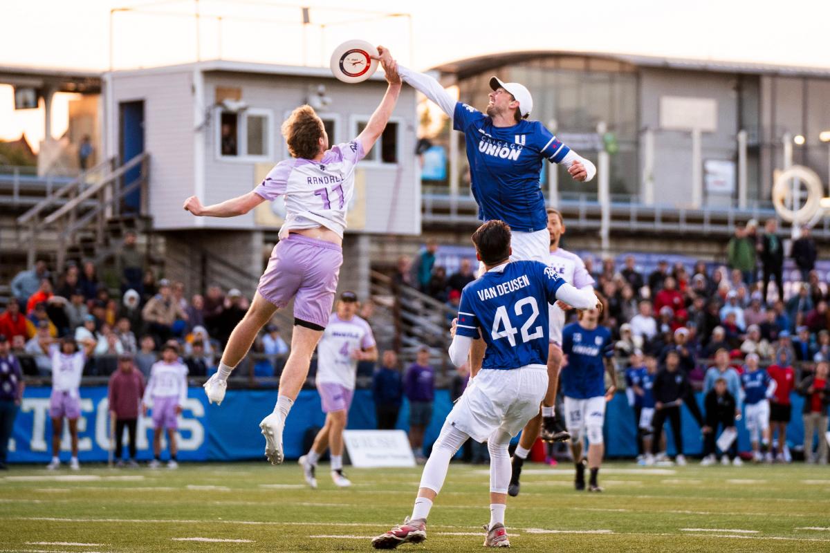 Atlanta’s Austin Taylor was absolutely brilliant in leading the Hustle offense throughout the game, but Chicago’s fierce pressure forced a high-stall shot down the sideline late in overtime, when the Hustle were up by one. It looked like a truly exceptional throw into a super tight window, but the Union’s Jace Bruner soared for a stunning and spectacular block, once again breathing life into Chicago’s fading chances.