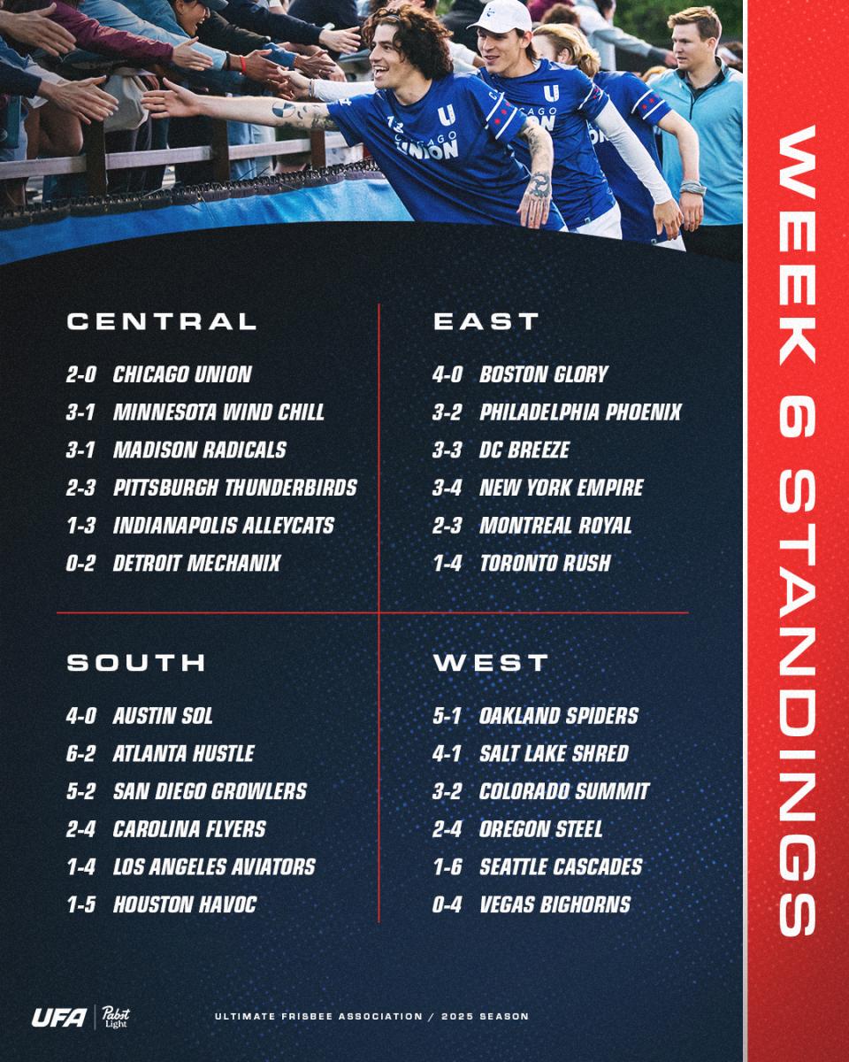 Speaking of those storylines, Week 6 sure felt like it set a new standard for breathtaking action. We witnessed an invigorating 13-game slate, with the majority of the contests coming down to the wire. Two more tilts went the distance to double overtime, including the Atlanta-Chicago “Game of the Week” that lived up to the hype and then some. We saw three winless teams pick up their first wins, and a pair of undefeated powers suffered their first loss. Overall, it truly was a riveting and fulfilling three days of frisbee.