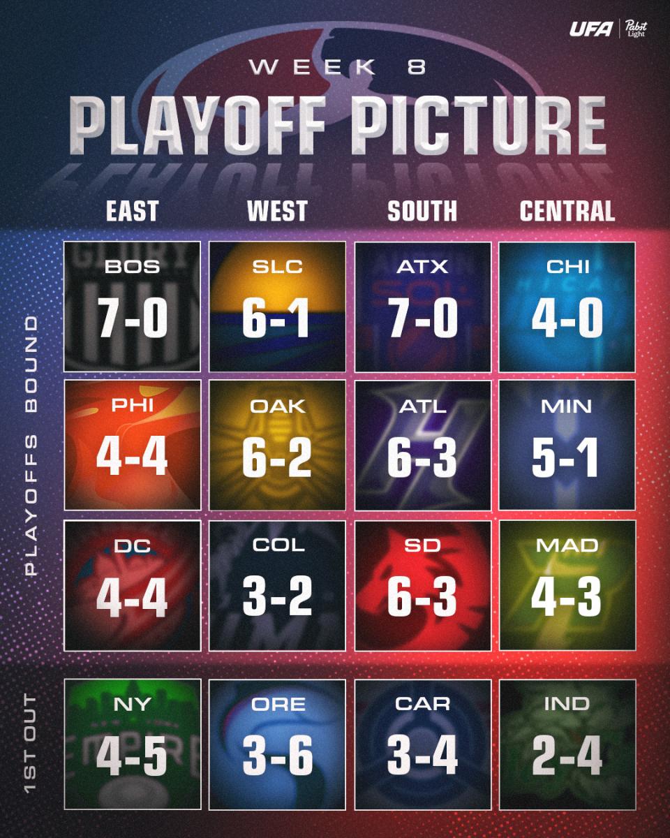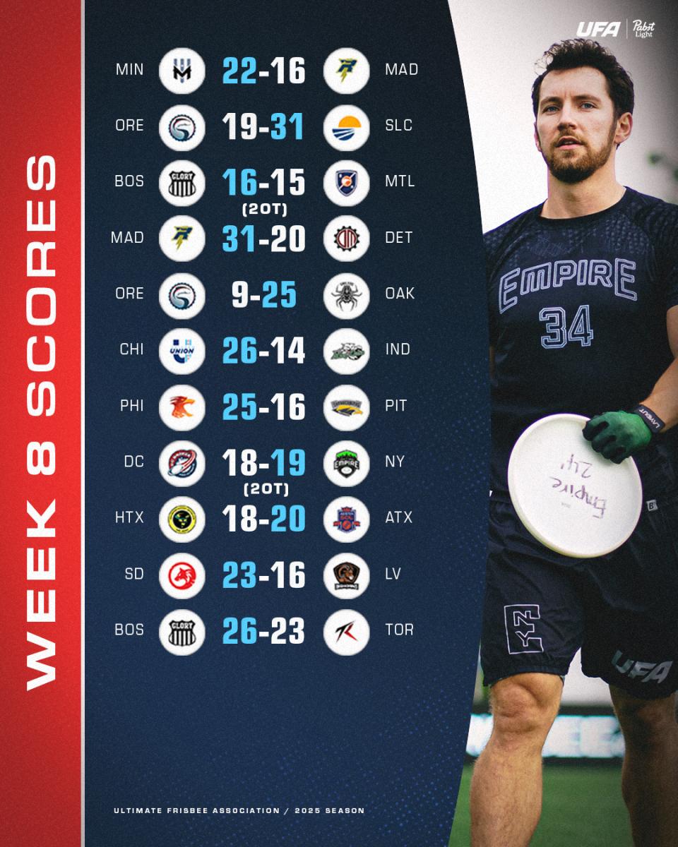 Salt Lake and Oakland combined to outscore Oregon 56-28 across the Steel’s two Week 8 blowouts, while the Madison Radicals bounced back from their Minnesota loss by bashing Detroit 31-20.