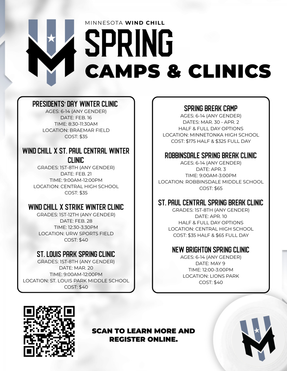 The Minnesota Wind Chill are excited to announce their largest-ever lineup of spring and summer youth ultimate frisbee programming, running from March through August. They will offer a wide range of programs across the Twin Cities and Greater Minnesota, including spring clinics, spring break camps, and summer camps. Designed for youth, middle school, and high school players, the spring and summer schedule provides accessible, high-quality development opportunities for athletes of all experience and skill levels.