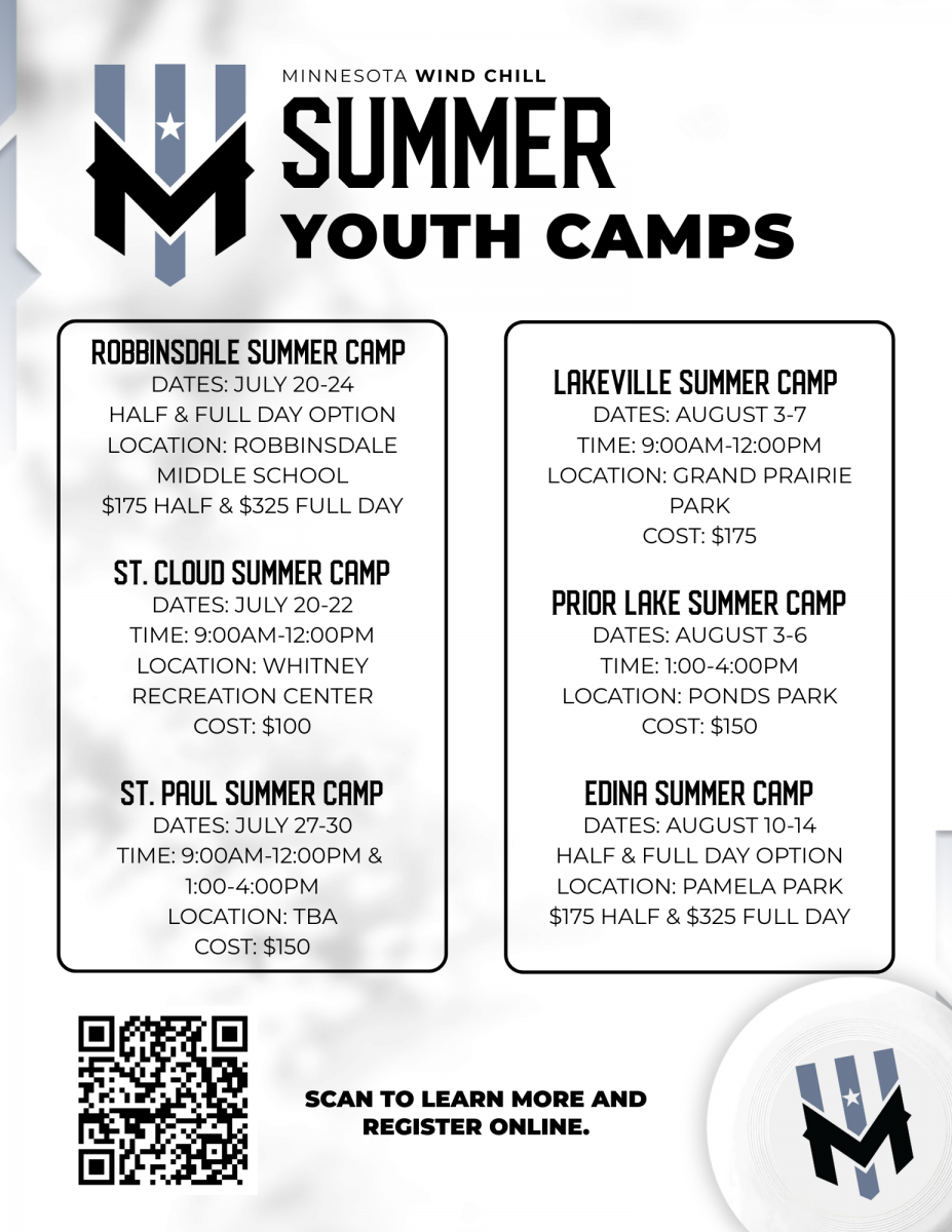 The Minnesota Wind Chill will host summer camps throughout the Twin Cities and Greater Minnesota, including in Woodbury, Rochester, White Bear Lake, St. Paul, Minnetonka, Wayzata, Robbinsdale, St. Cloud, Lakeville, Prior Lake, and Edina. Camps range from half-day to full-day formats and emphasize skill development, team play, and fun in a supportive learning environment led by Minnesota Wind Chill players and other experienced female-matching and male-matching coaches.
